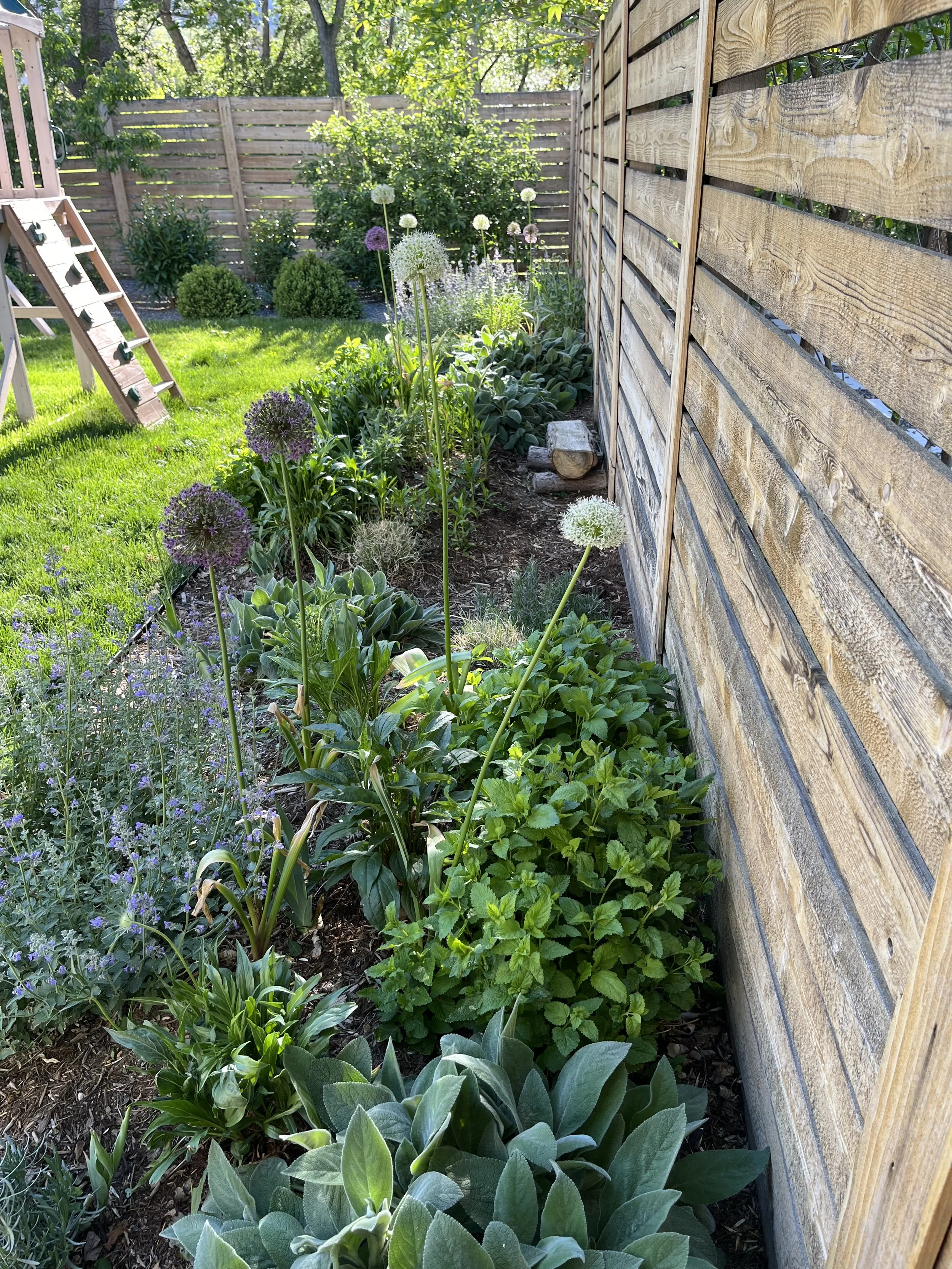 Children’s sensory garden & whimsical play spaces —In the backyard, we created a winding sensory garden filled with soft lamb’s ear, textural grasses, and fragrant foliage. Pops of daisies invite children to make daisy chains, while small corners of the garden feel like a miniature fairyland, sparking imagination and play. The planting layout encourages exploration, discovery, and safe, tactile interaction for little hands and feet.